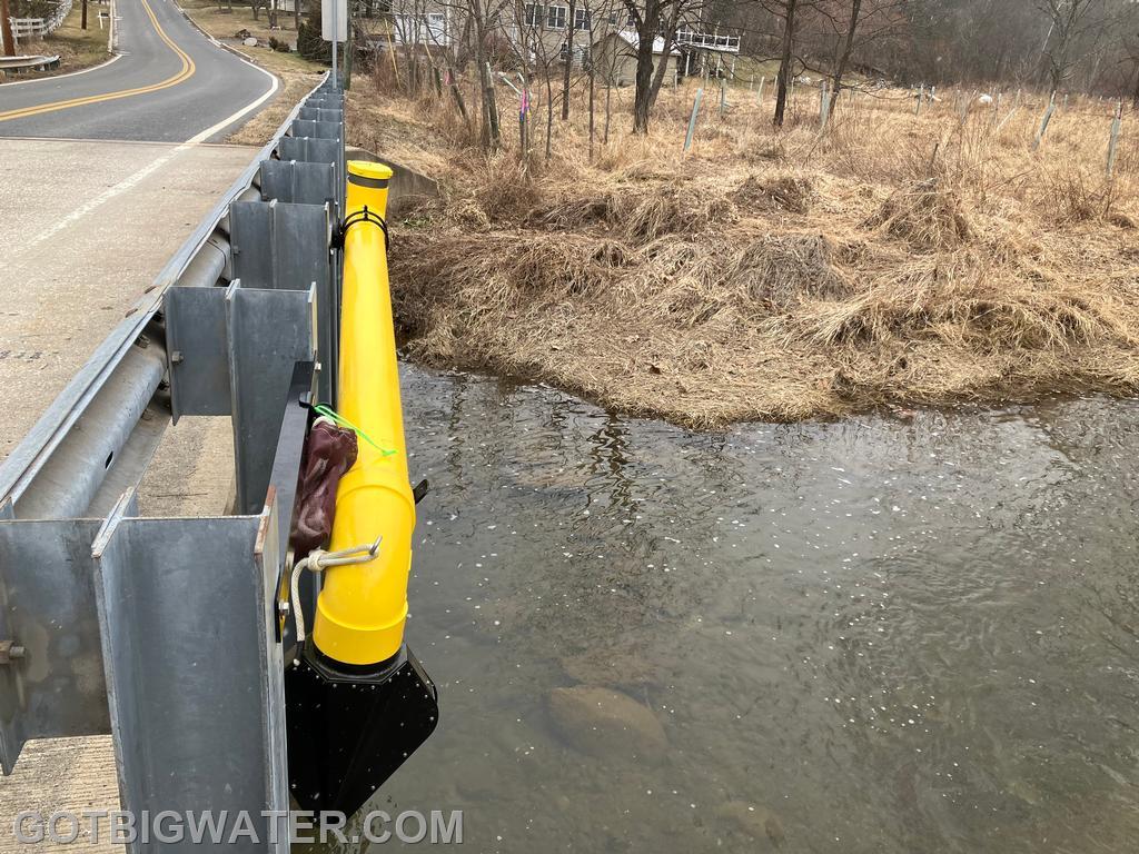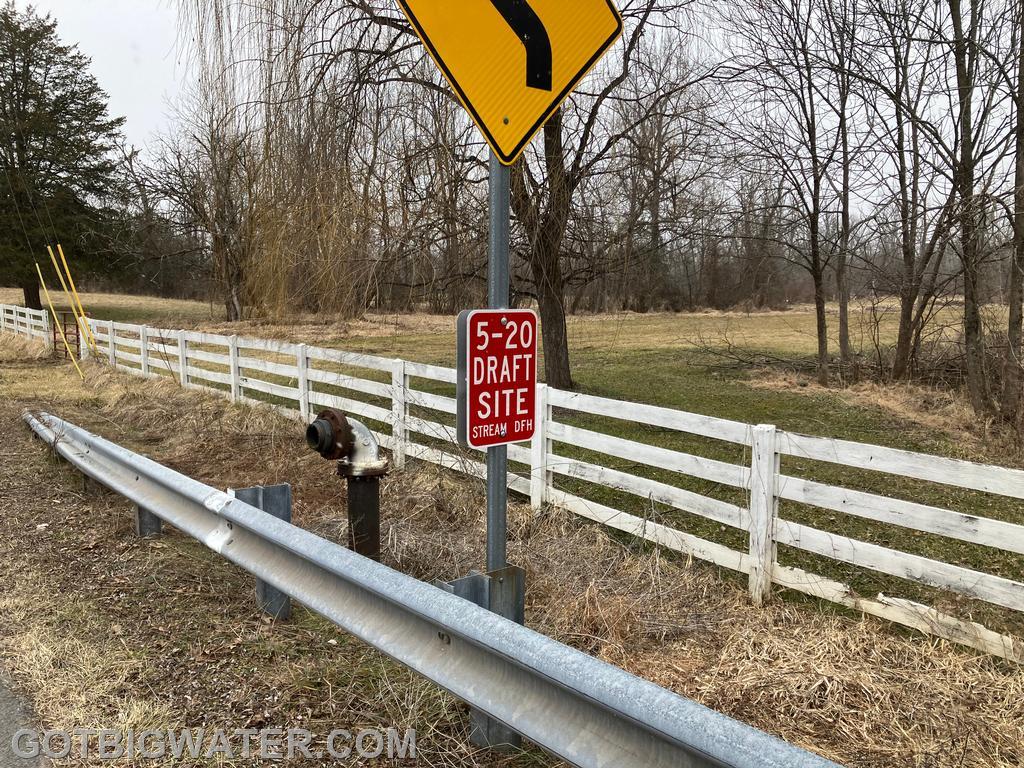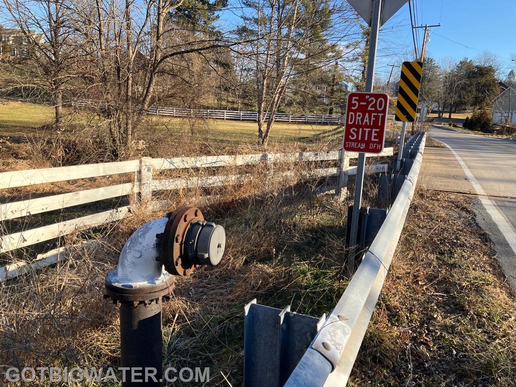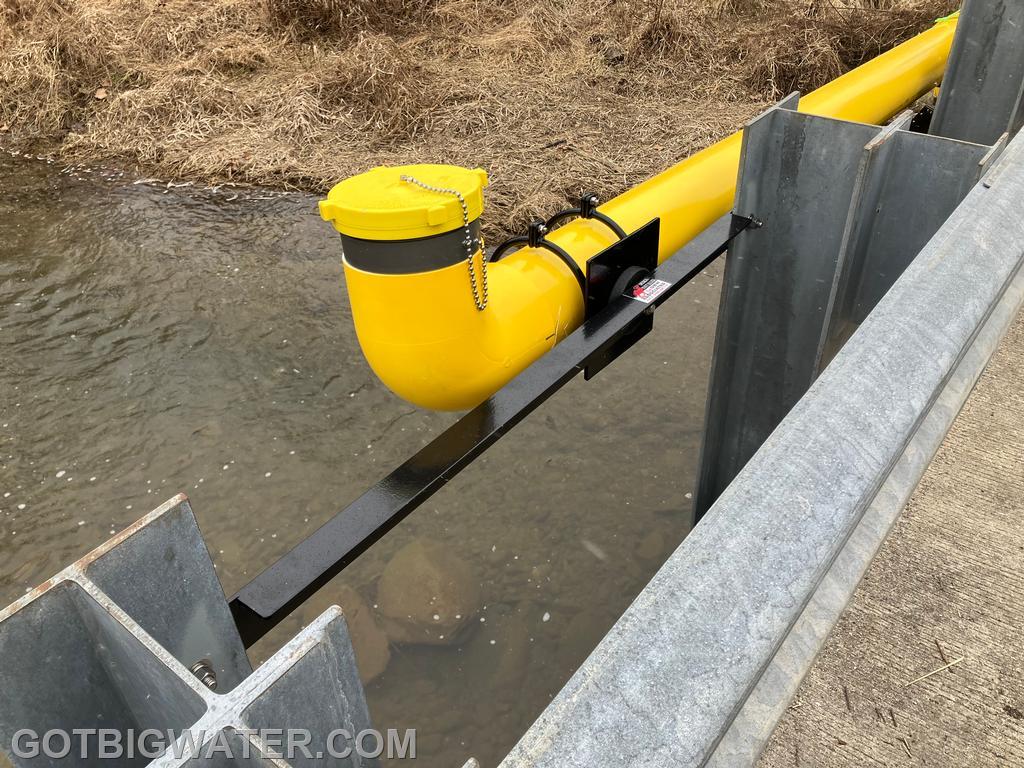 The hydrant was placed on the bridge over Bear Branch on Mayberry Road in Taneytown, Maryland. The installation used a 6-inch ETT Male DFH head, a 6-inch ETT stream strainer, and our angle-mount brackets. The lift was just under 10 feet, and the site provided adequate water to support a large flow. The installation replaced a fixed-DFH system that no longer worked.