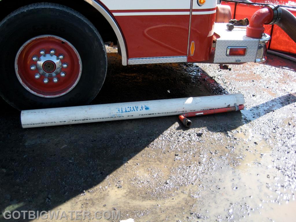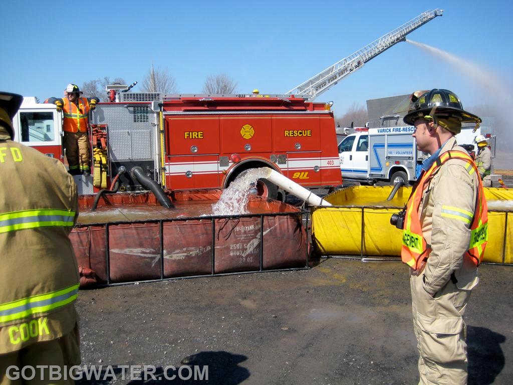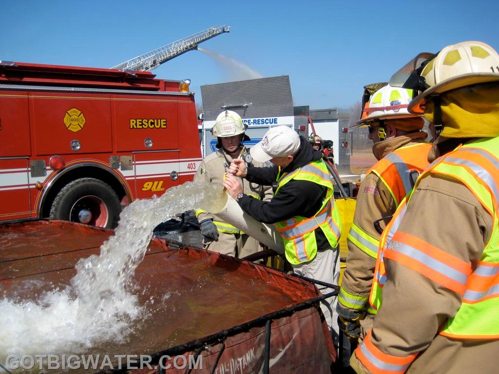 From our 2012 seminar in Seneca County, NY, here are several photos showing a homemade water transfer device being used during our two-hour tanker shuttle drill. The six-inch PVC jet siphon tube was locally constructed and successfully transferred water throughout the event.